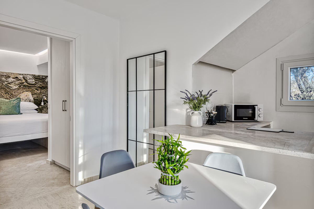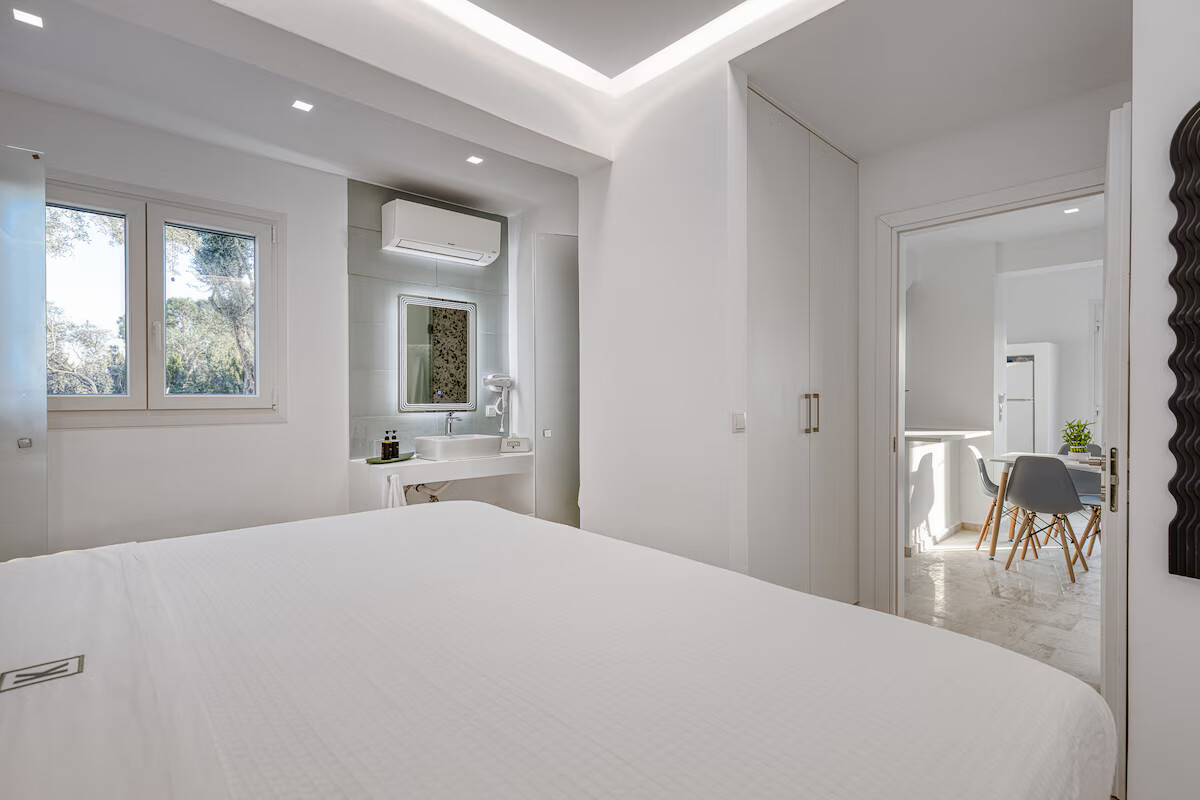 Experience laid-back luxury in the Zeus Suite at Villa K Boutique Hotel located in Corfu’s exclusive Kommeno Peninsula, this spacious 2-bedroom en suite features a king bed and two singles or another king bed, a cozy living area, kitchenette, and private terrace. Enjoy full access to our large pool, poolside bar, gourmet breakfast and state of the art Gym including stuidio pilates reformers. The Zeus Suite is our premier accommodation—perfect for guests seeking extra space and privacy while enjoying all the amenities of Villa K.