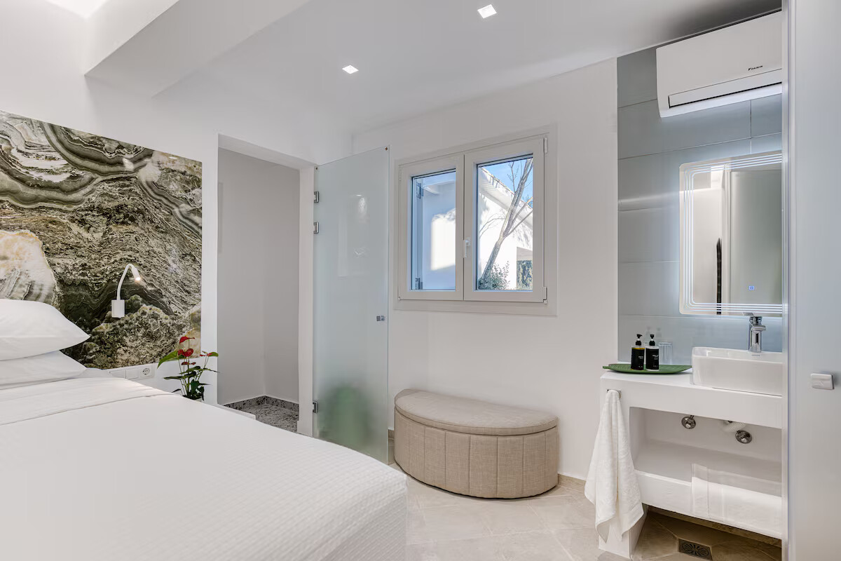 The Zeus Suite is designed with a blend of minimalist elegance and natural comfort, ideal for couples, friends, or small families (ages 12+) who want both shared space and privacy. Like all of Villa K, it features thoughtful touches, from quality cotton bedding and premium toiletries to access to fast Starlink Wi-Fi and housekeeping Monday to Saturday.