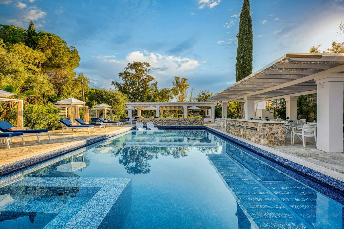 ✔️ A 17-meter swimming pool with jacuzzi, luxury daybeds, and shaded areas
