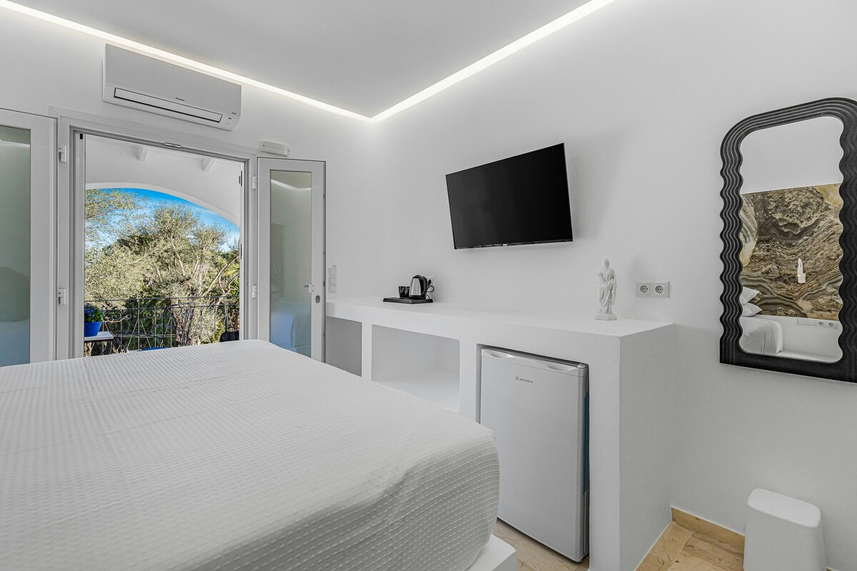 The Athena Room at Villa K Boutique Hotel is a bright and elegant retreat, offering partial sea views and a perfect blend of comfort, style, and serenity 🌿 Located on the upper level, it features a private furnished balcony, accessible via 6 steps, ideal for enjoying a sunrise coffee or a sunset drink in a peaceful setting.