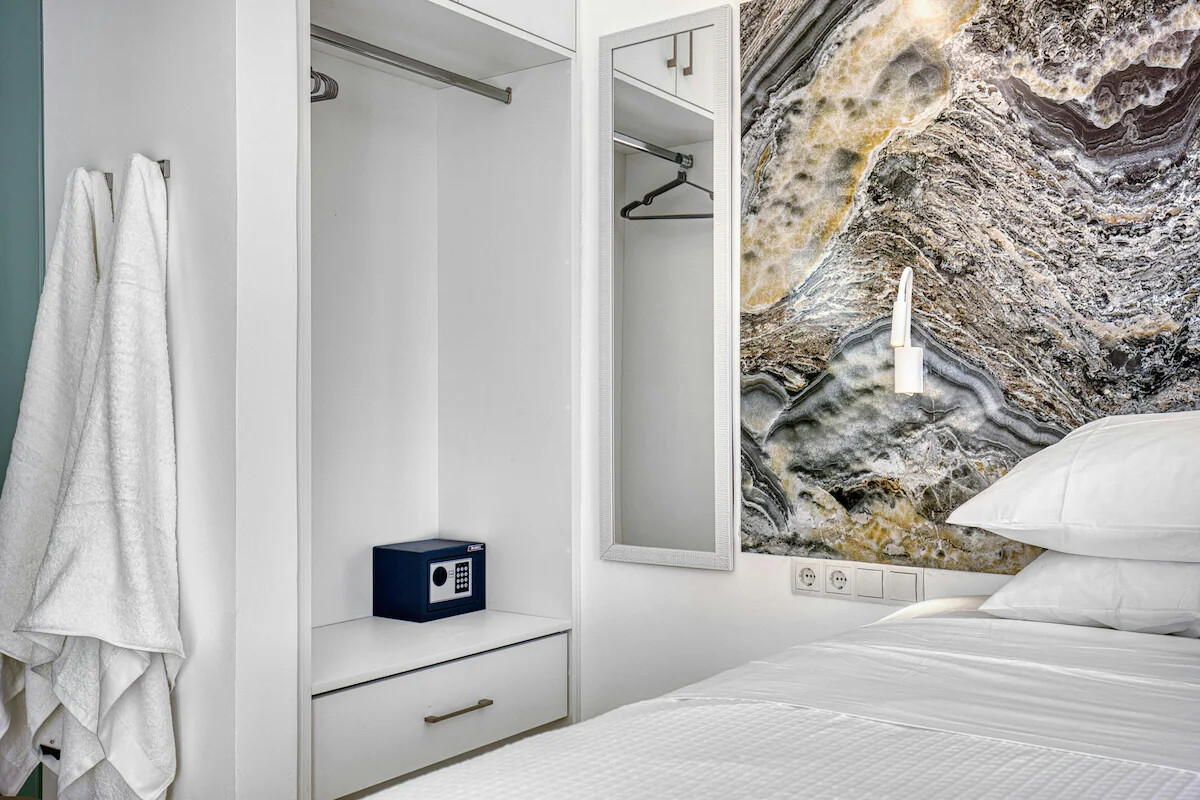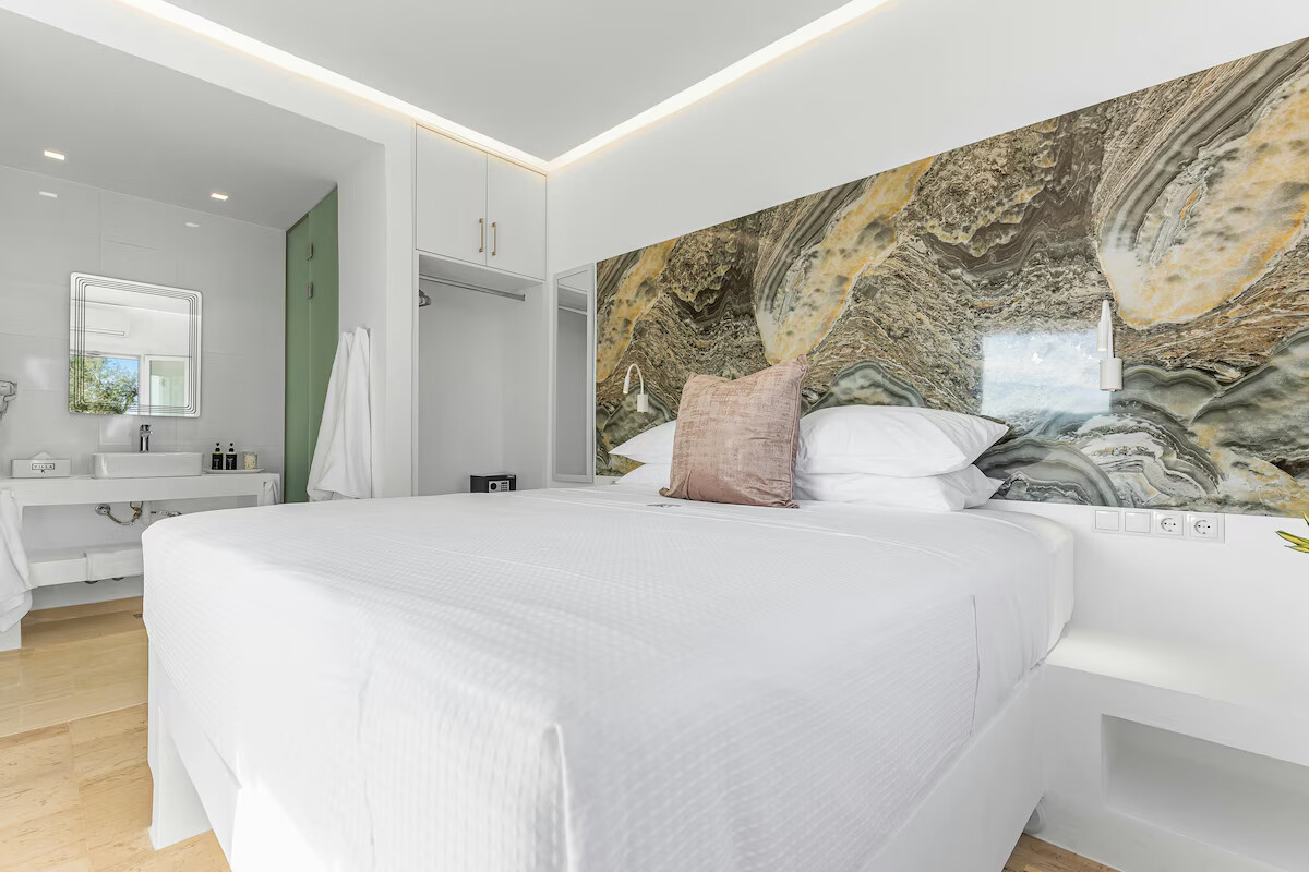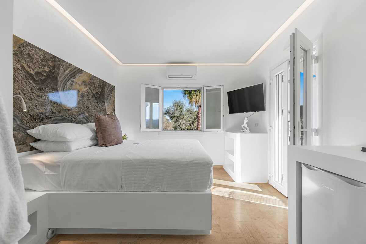 Designed with minimalist elegance and soft natural tones, the Poseidon Room offers a relaxing, light-filled environment—ideal for unwinding after a day exploring Corfu.