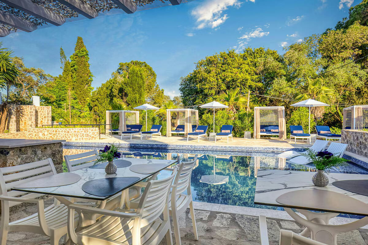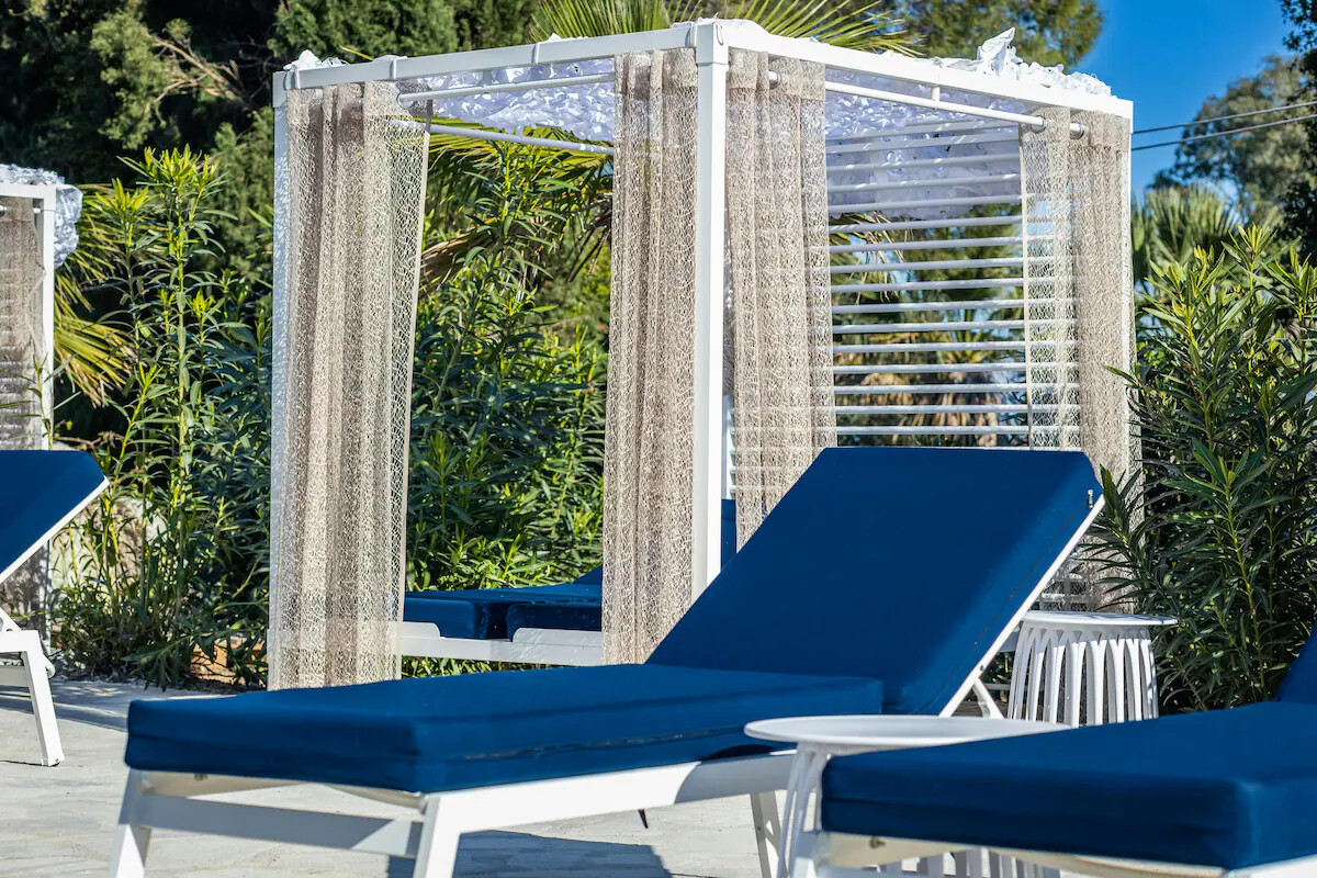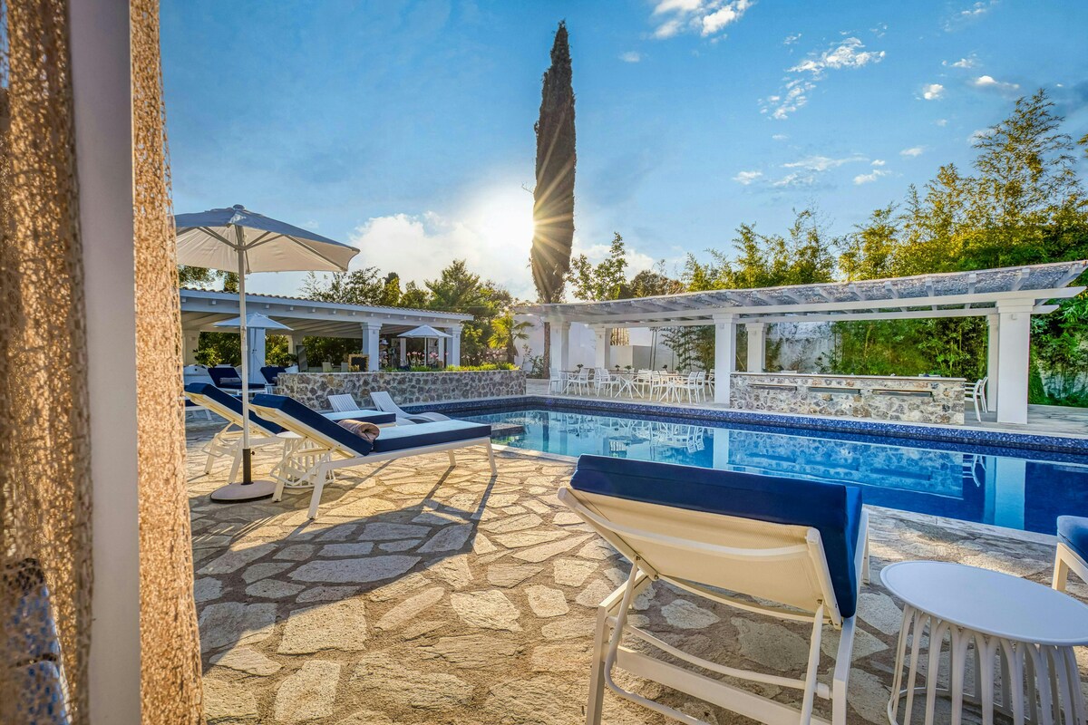 ✔️ 17-meter swimming pool with jacuzzi, luxury loungers, and shaded areas